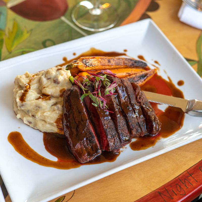 10 oz steak with garlic mashed potatoes, roasted baby carrots, and a red wine demi-glace.