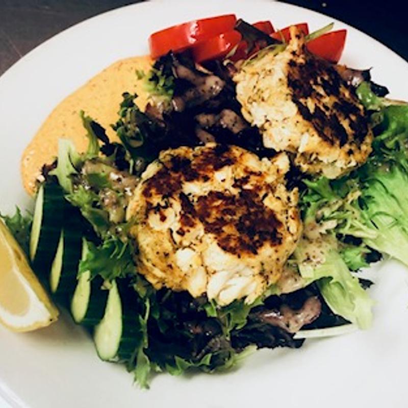 Two grilled Maryland crabcakes over vinaigrette dressed greens with sliced tomato, cucumbers, and a creamy roasted red pepper sauce.